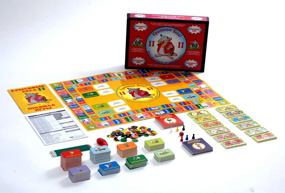 У порівнянні з цим комплект "Крысиные бега 1+2" надає просто колосальний обсяг корисних знань, навичок та унікального ігрового досвіду. Щоб зрозуміти це - достатньо відкрити коробку "Крысиные бега 1+2". Дві гри в ній ледве вміщаються і втрамбовані так щільно, що кожен міліметр зайнятий.
